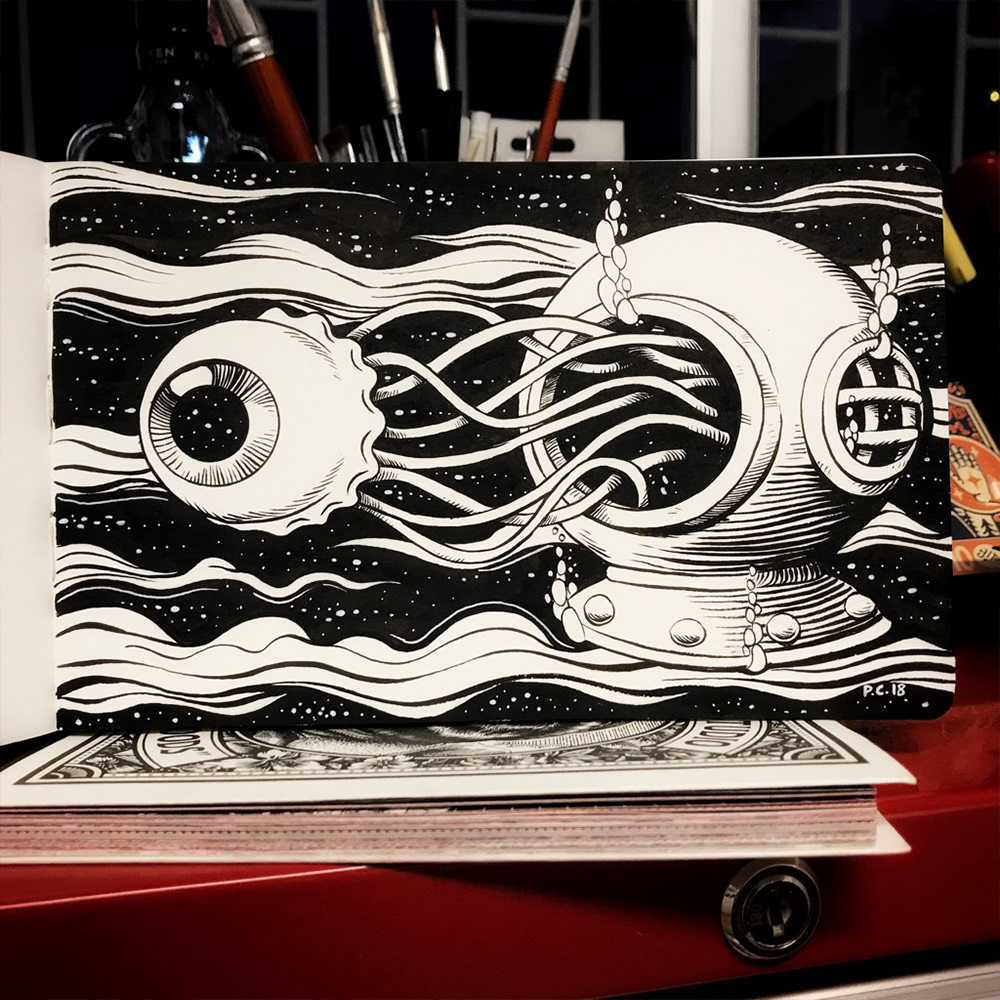 Dive: Brush and ink over Moleskine Watercolor album + colors on Procreate app