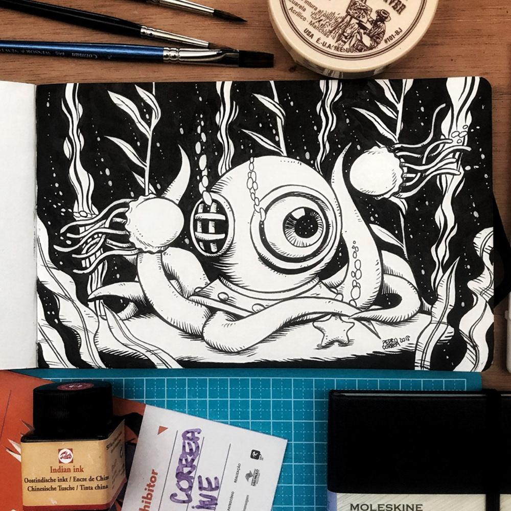 Scuba: Brush and ink over Moleskine Watercolor album + colors on Procreate app