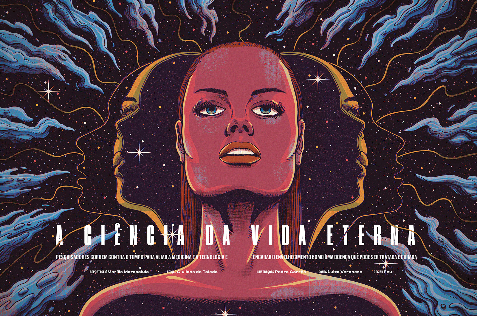 Illustrations made for the cover story of Revista Galileu #337. The subject: Silicon Valley researchers think that aging is a disease and they are using medicine and technology to make us live longer, better and younger.