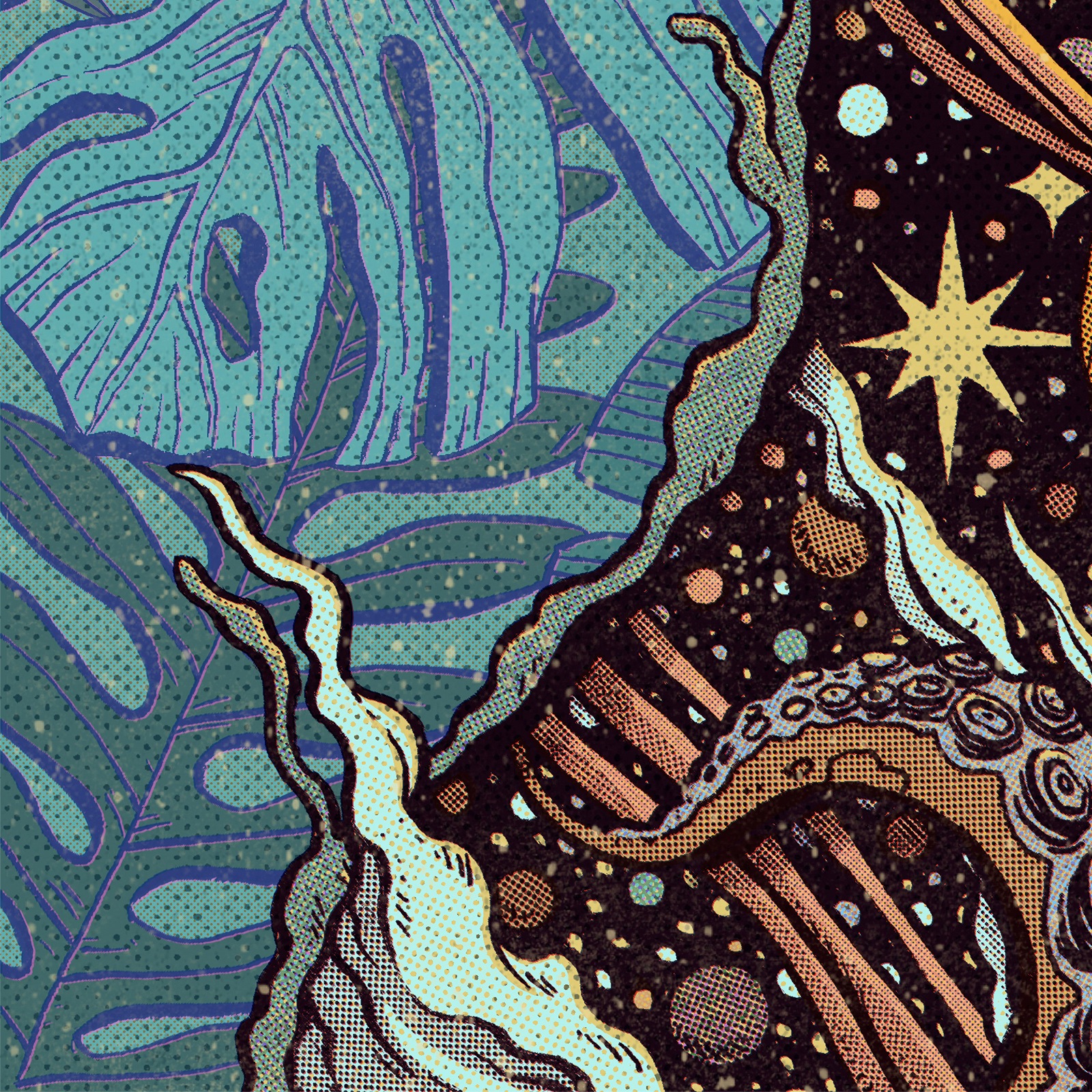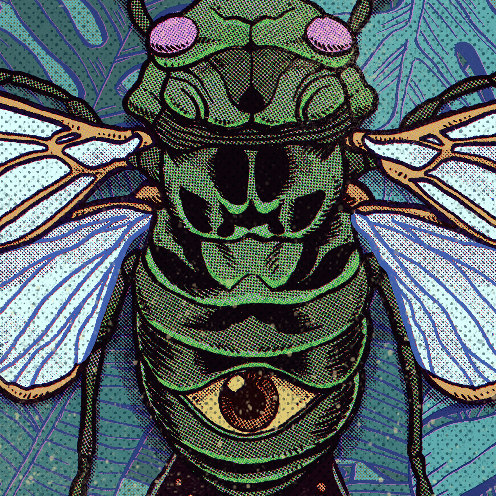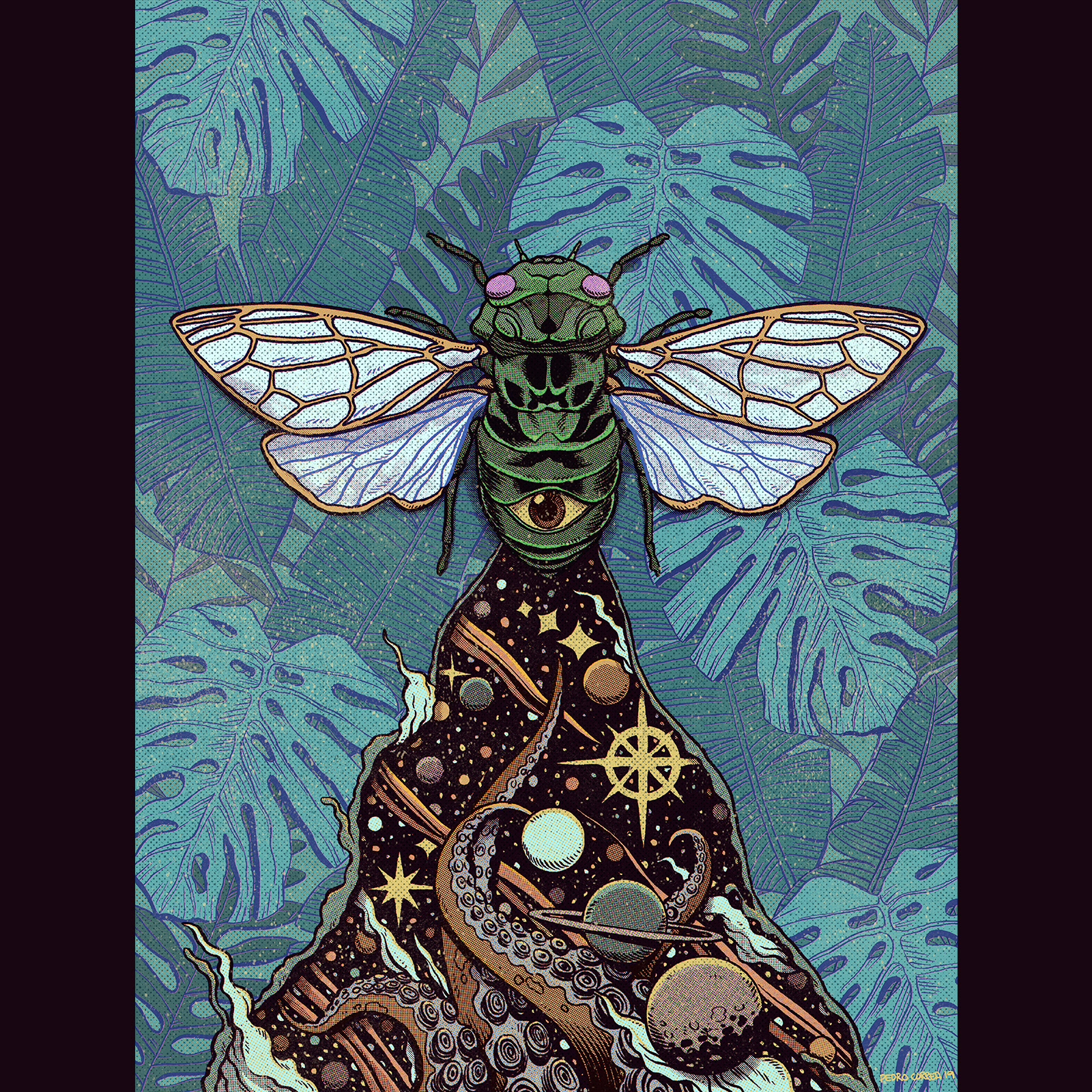 Poster made for Jade Cicada (Skyler Golden), an electronic music producer from Denver, CO. Ink, screentones and markers over watercolor paper and colors and digital textures on Photoshop.