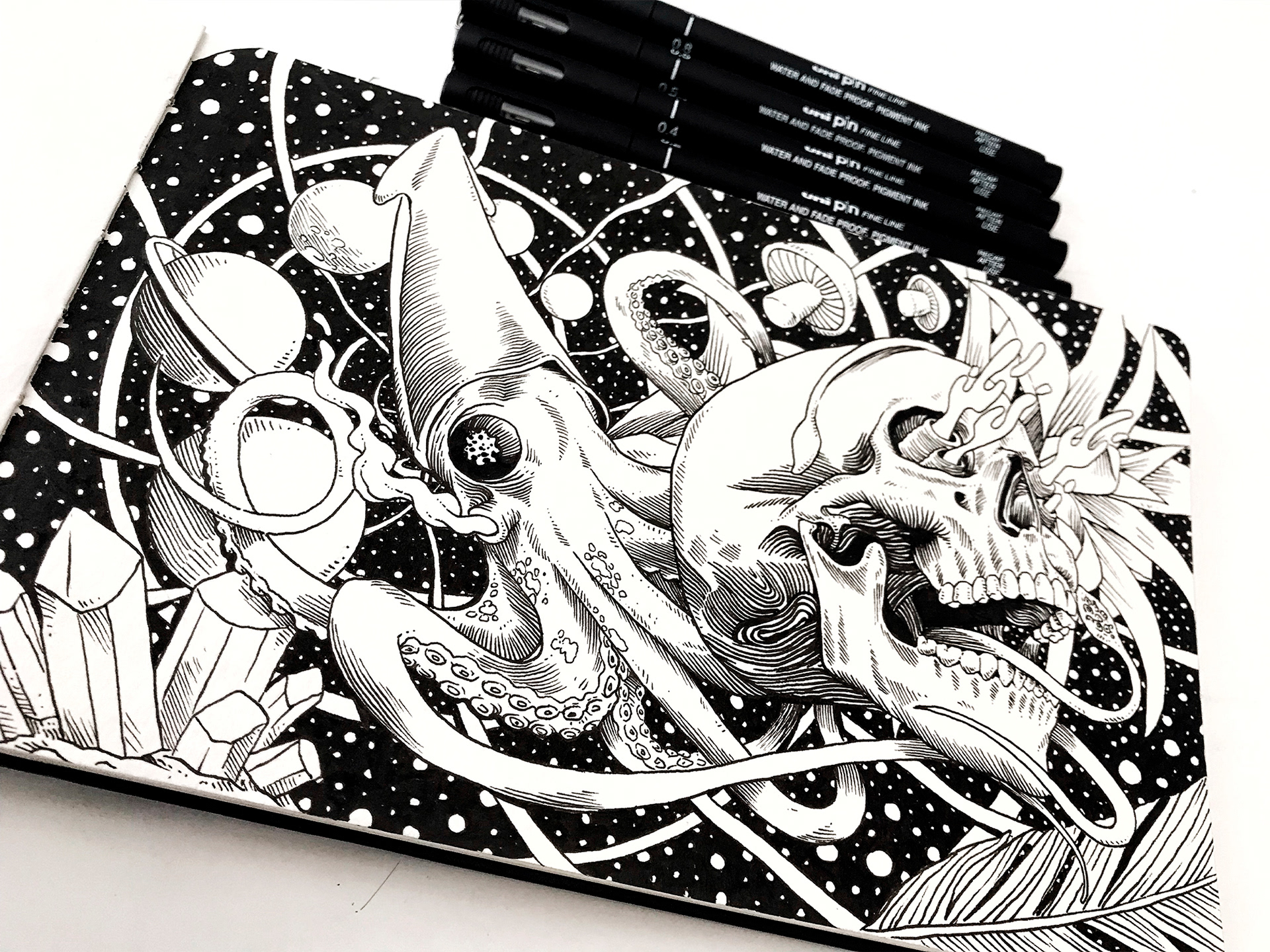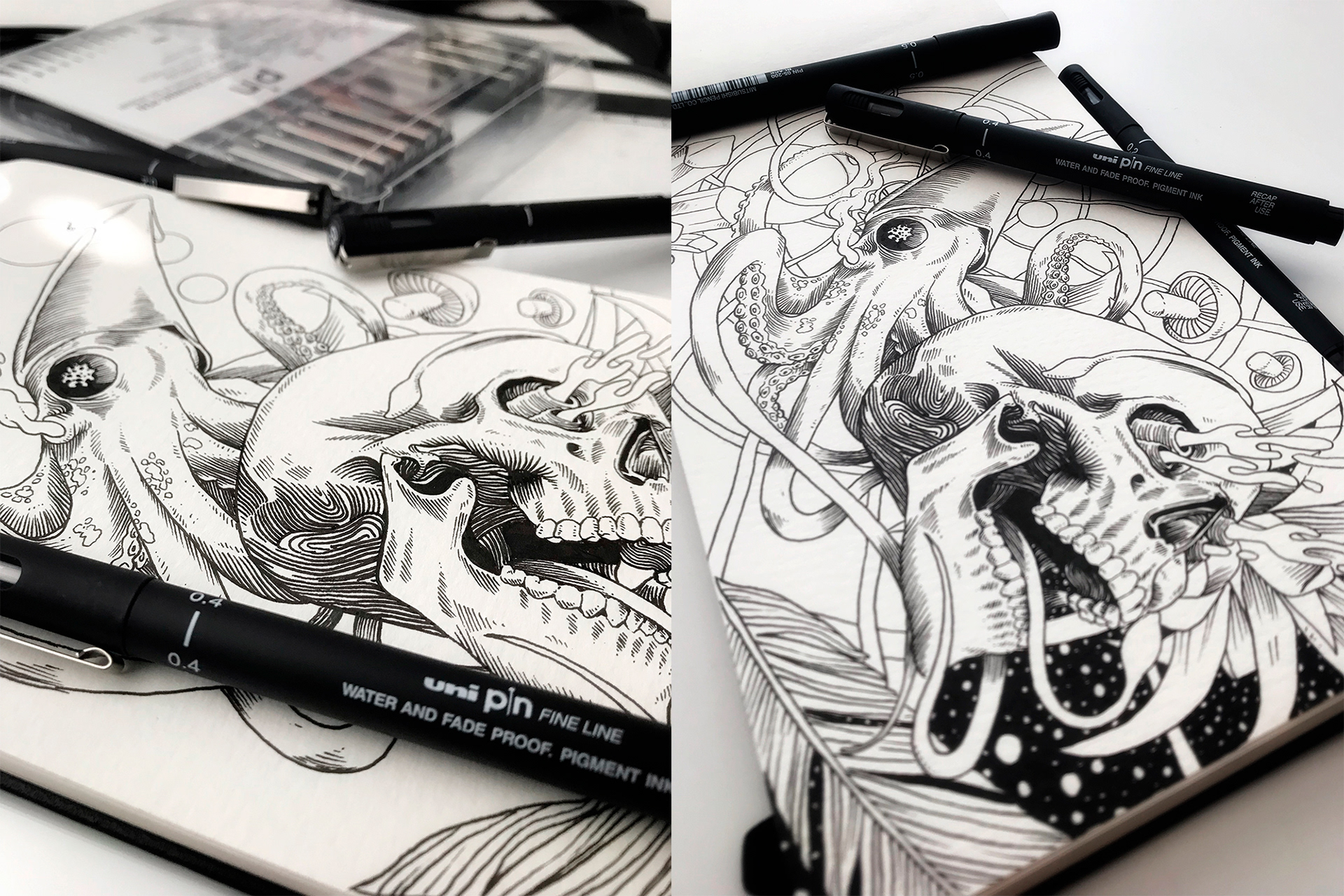 Inking with fine line pens by Uni Ball (UniPin)