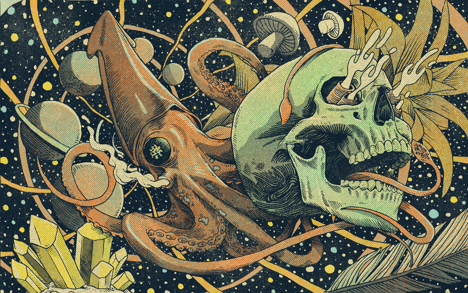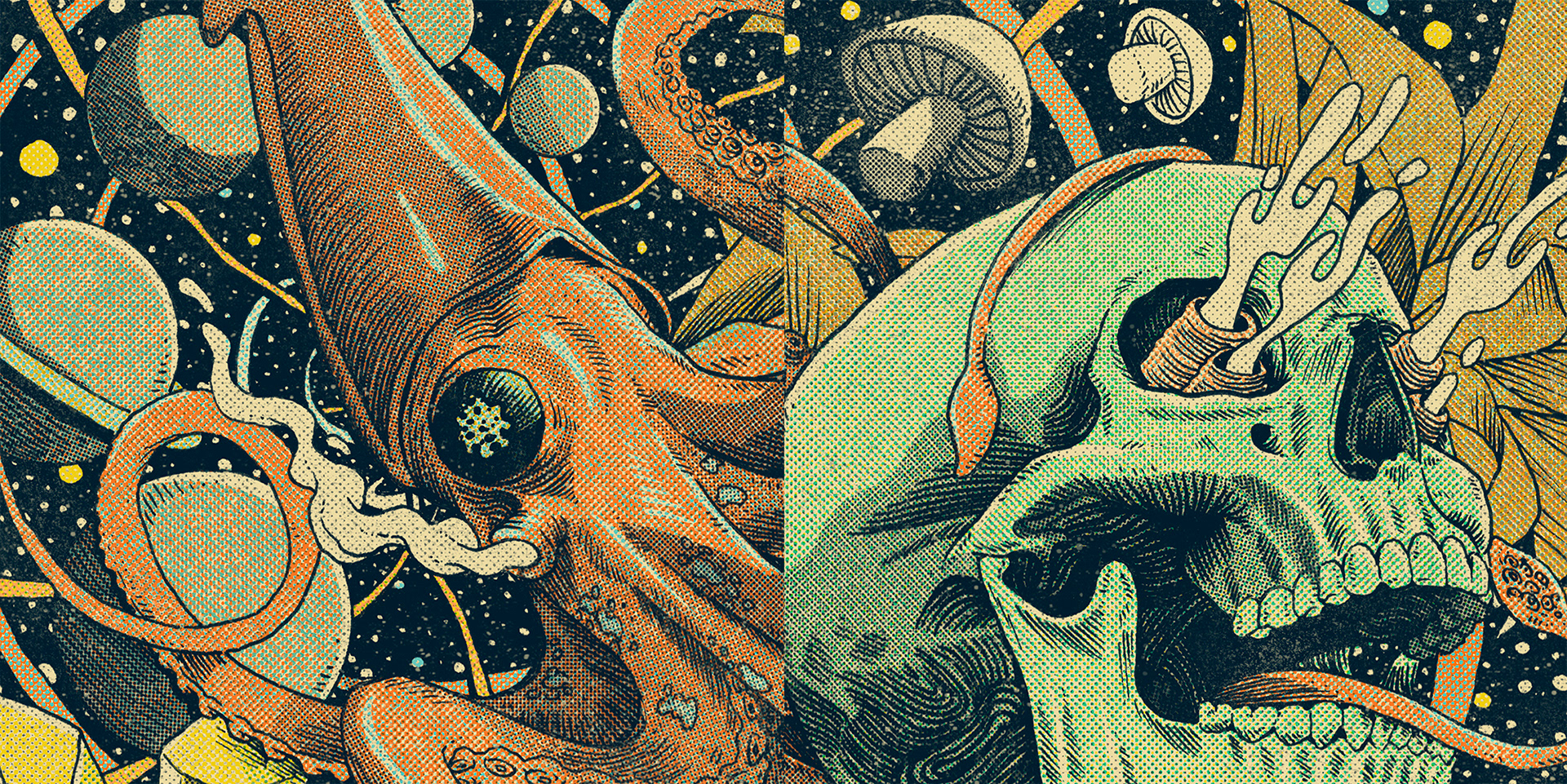 Ink (Uni Pin) + screen tone (I-C Screen) over Moleskine Watercolor Album. Colors and textures made digitally (textures by True Grit Textures Supply)
